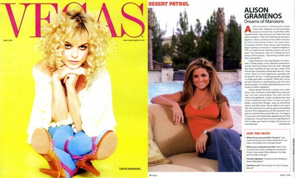Alison Gramenos is following her dream career path, whipping up stunning design projects in brand-new, multimillion-dollar neighborhoods. After moving to Las Vegas from her native Chicago in 1999, the Greek beauty received her degree in interior architecture from UNLV and started with local design studio. Four years later, Christopher Homes came calling, and Gramenos began working on mansion in Southern Highlands. “The Las Vegas home-building industry was at its peak,” says Gramenos, who at 25 already has firm grasp of the business. “The timing couldn’t have been more perfect.